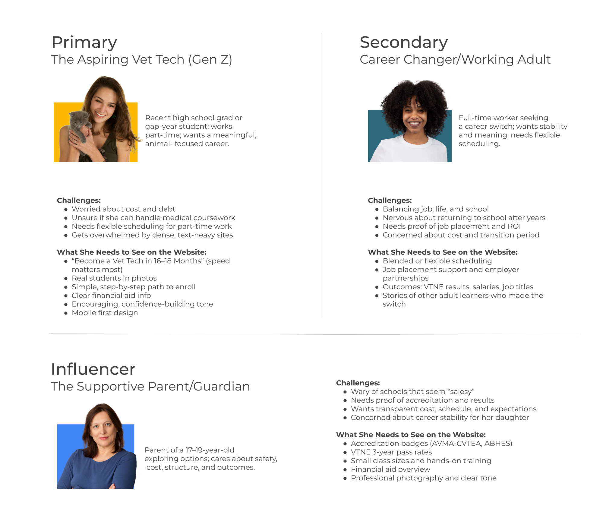 Defined primary, secondary, and influencer audiences to clarify what each group needs to see before taking the next step — whether that's requesting info or applying.